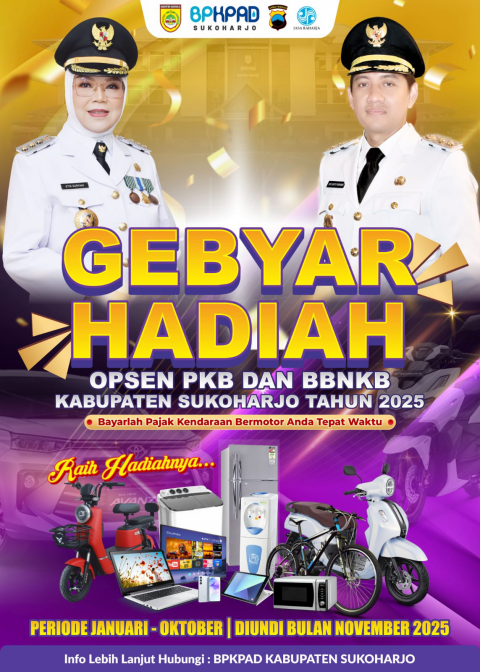 Dalam program Gebyar Hadiah Opsen PKB & BBNKB 2025, Pemkab Sukoharjo menyediakan berbagai hadiah menarik bagi wajib pajak yang memenuhi syarat. Hadiah tersebut antara lain